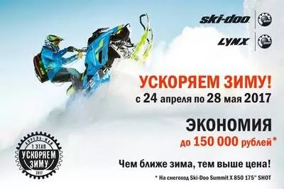 Зимний сезон подошел к концу, а это значит, что пришло время готовиться к новому зимнему сезону! С 24 апреля по 28 мая 2017 года мы запускаем первый этап акции «Ускоряем зиму». Уже сейчас вы можете заказать снегоход по самой выгодной цене: скидки на ряд моделей составляют до 150 000 рублей!
